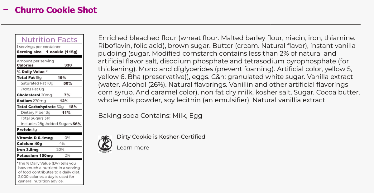 ✔ Our cookie shots do not contain nuts, but they are made in a facility that handles nuts and tree nuts using shared equipment.